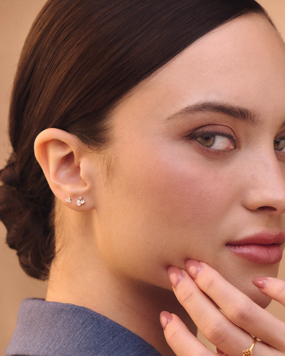 The Bina Flatback Stud showcases a unique combination of pear and emerald cut cubic zirconia, perfect for a modern ear stack. This stylish and distinctive stud is comfortable for all-day wear in any piercing. Available in both gold and silver finishes.