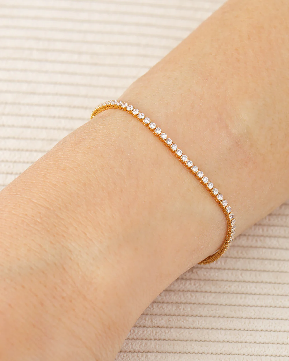 Featuring a dazzling row of Cubic Zirconia crystals, the Kirsten Gold Bracelet is a classic style staple. Whether you wear it on a casual day out or to a formal event, you can’t go wrong with this timeless tennis bracelet.