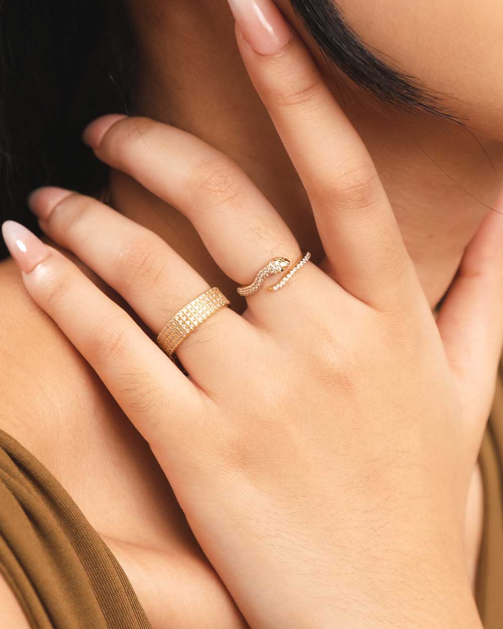 Taking inspiration from the engagement ring Prince Albert designed for Queen Victoria, this ring signifies infinite passion and everlasting dedication. A snake motif paved with glittering Cubic Zirconia stones, its unique open-front design was made to wrap around the finger perfectly. Embrace eternity with the seductive Sabine Gold Ring.
